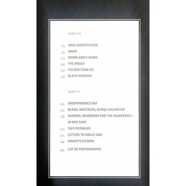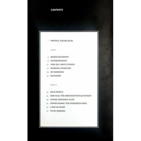 "On the occasion of Saadat Hasan Manto's birth centenary, there is a pressing need to put the record straight by making his work accessible across the linguistic divide between Urdu and English that hinders a free flowing exchange of ideas within Pakistan. Consisting exclusively of Manto's writings, this limited edition commemorative volume is intended to be as much a visually pleasing experience as a reading one. Divided into four parts, it showcases Manto's autobiographical pieces; personality sketches, selected short stories and essays, and for the first time brings into the public domain several hitherto unpublished photographs of the author and his family and friends." - Ayesha Jalal